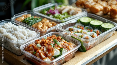 Modern Thai food lunch boxes in plastic packages. AI generated