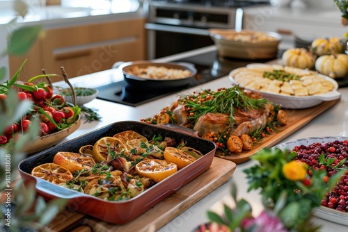 Modern Thanksgiving Buffet with Traditional and Plant-Based Dishes in a Contemporary Kitchen Setting