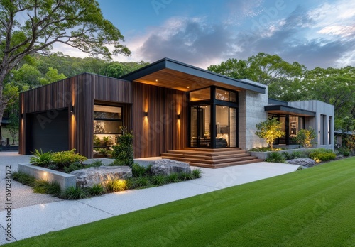 Modern timber cladding on the exterior of an Australian home, featuring dark brown wood with white accents