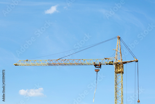 Modern tower crane against blue sky. Construction site