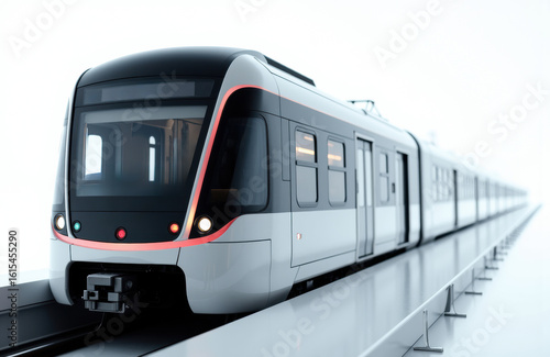 Modern train traveling on elevated track in a bright, clean environment with sleek design and smooth surface