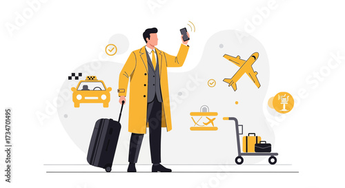 Modern traveller using app for transportation at airport, vector illustration ready to travel and