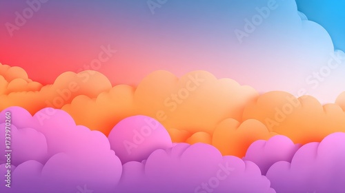 Modern trendy background with paper cut style clouds on top and bottom. Beautiful gradient in orange, red, pink, purple and blue tones with text space for design projects