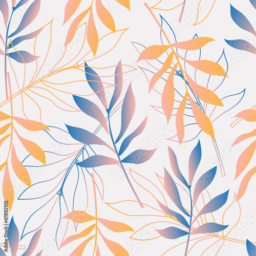 Modern tropical leaves in yellow and blue gradient on a white background create a seamless pattern for fabrics.