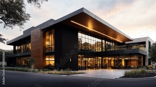 Modern two-story commercial building with large glass windows and sleek architectural design, surrounded by landscaped greenery and parked cars visible in the foreground.