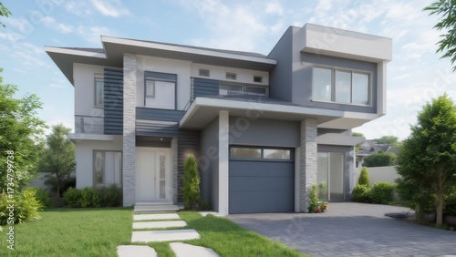 Modern two-story home with gray exterior and manicured lawn, daytime