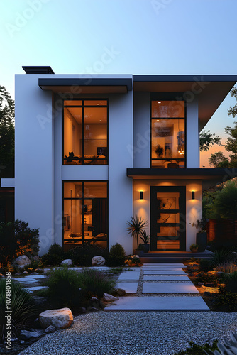 Modern two-story home with large windows and a stone pathway leading to the front door.