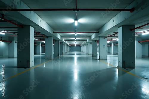 Modern underground parking garage with bright overhead lights, clean floor, and concrete pillars in empty space