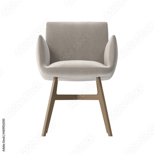 Modern Upholstered Armchair with Wooden Legs and Beige Fabric - Front View Isolated