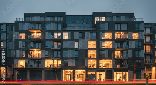 Modern Urban Apartment Building Facade Illuminated at Dusk with Warm Windows and Red Light Trails