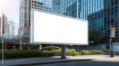 Modern urban cityscape with a large blank digital billboard display on a busy street surrounded by glass skyscrapers and greenery in daytime