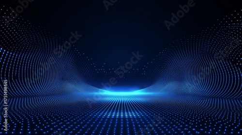 Modern vector design showing an illuminated midnight blue stage framed by sweeping LED laser arcs, subtle halftone patterns and radial gradients accentuating a product silhouette