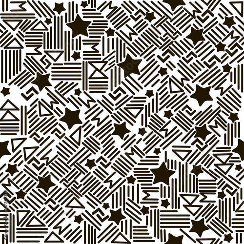 Modern vector seamless pattern of black and white stars, triangles, signs. Decorative ornament backdrop for fabric, textile, wrapping paper