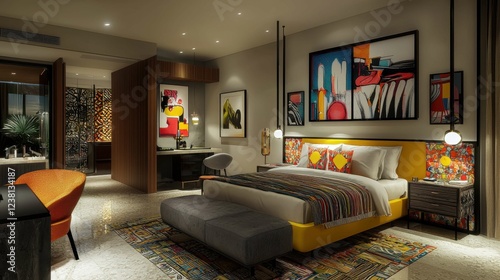 Modern Vibrant Bedroom Design with Colorful Accents and Art