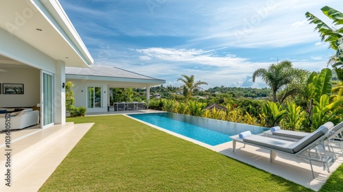 Modern villa with a pool overlooking lush greenery and a clear sky.