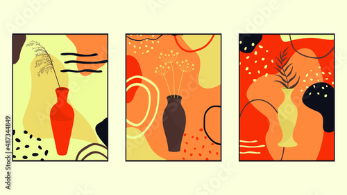 modern wall art collection boho style, ceramic vases with plant, abstract shapes, lines and dots.