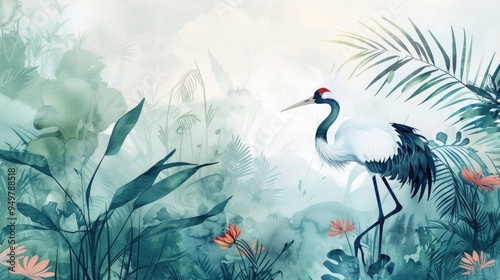 Modern wallpaper. Watercolor jungle illustration. Crane bird elements, watercolor painting wallpaper. Mural wallpaper. AI generated illustration