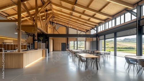 Modern warehouse interior with clean lines and open space, showcasing industrial simplicity and functional design.