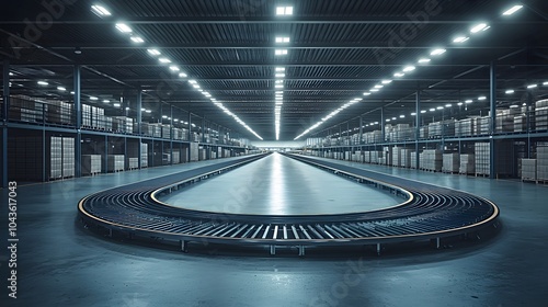 Modern Warehouse with Conveyor Belt and Shelving Units
