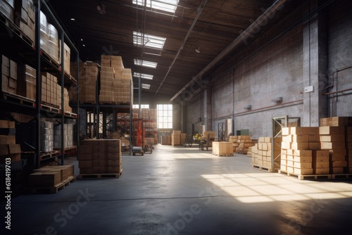 Modern warehouse with shelves and stock. AI generative