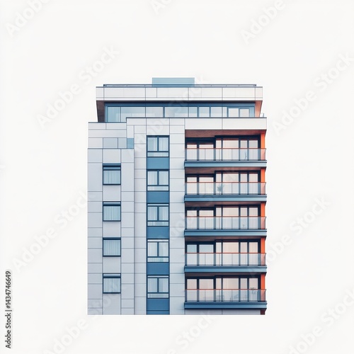 Modern White and Gray Apartment Building Facade with Balconies Against White Background