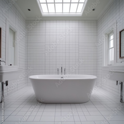 Modern white bathroom with freestanding tub, two sinks, and skylight.