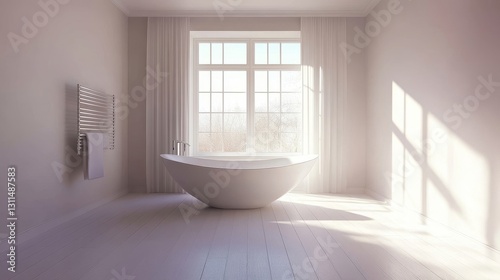 Modern white bathroom with freestanding tub, window, and natural sunlight