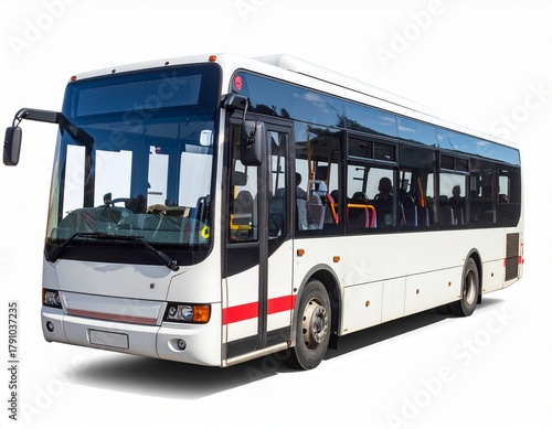 Modern White City Transit Bus or Coach Bus with Red Stripe, Isolated on a Clean White Background
