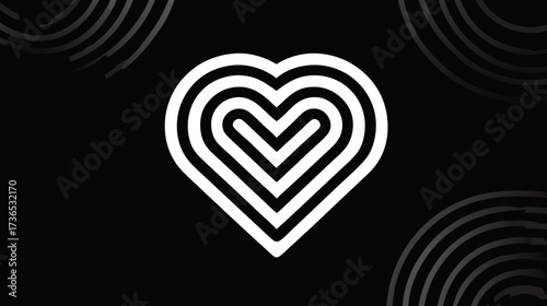 Modern white concentric line heart icon on black background, representing love, care, and connection. Minimalist graphic design.