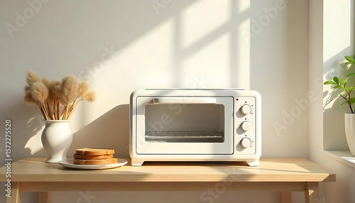 Modern white convection oven on wood table in minimalist kitchen, created with generative ai