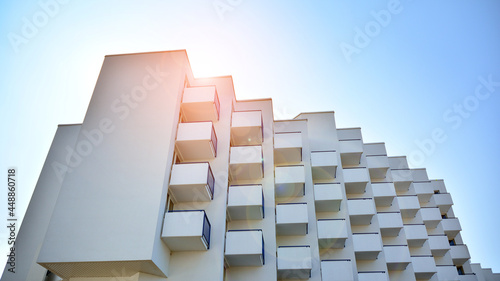 Modern white facade of a residential building with large windows. View of modern designed concrete apartment building.