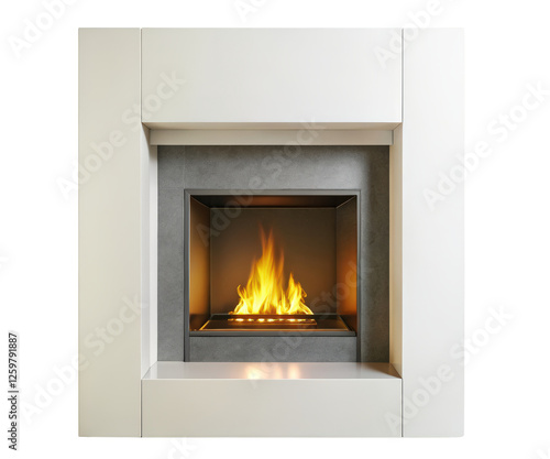 Modern white fireplace with a flame on a transparent background