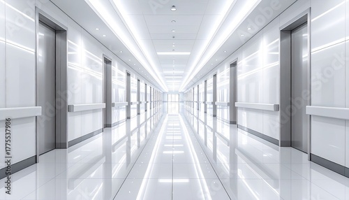 Modern White Hallway With Rows Of Elevators Illuminated By Bright Lights Reflecting On The Polished Floor
