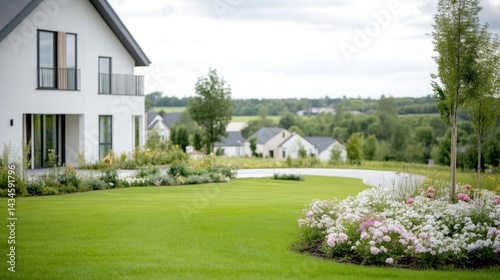 Modern white house with large windows and balcony surrounded by well-manicured green lawn and blooming flower beds, serene suburban neighborhood, and bright overcast day.
