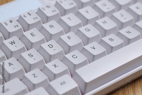 Modern white keyboard with RGB lighting on wooden table, closeup