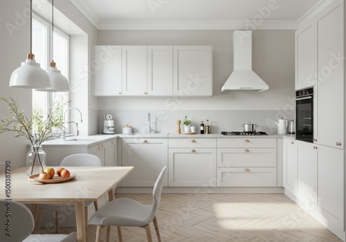 Modern White Kitchen Interior Design with Wooden Table and Natural Light Photo