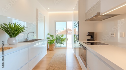 Modern white kitchen with wood floor, plants, and balcony view.
