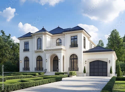 Modern White Mansion with Black Trim and Green Lawn