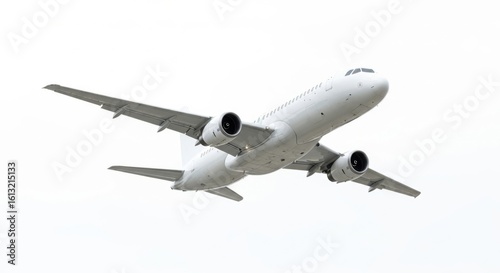 Modern white passenger jet airplane ascending against a clean white background