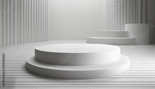 modern white product stage display scene 3d podium background with minimal geometric platform base or empty presentation round stand mockup and blank premium show pedestal soft clean floor concept