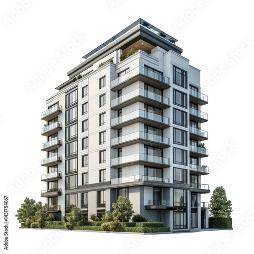 Modern White Residential Building With Glass Balconies And Green Trees Against A Transparent Backdrop