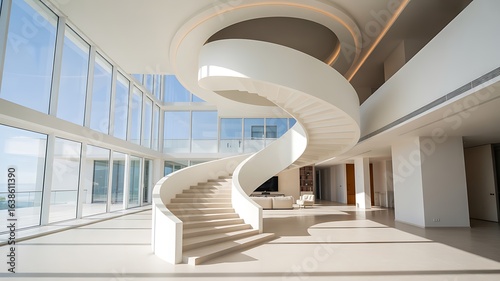 Modern white spiral staircase in a sunlit luxury villa with floor to ceiling windows interior