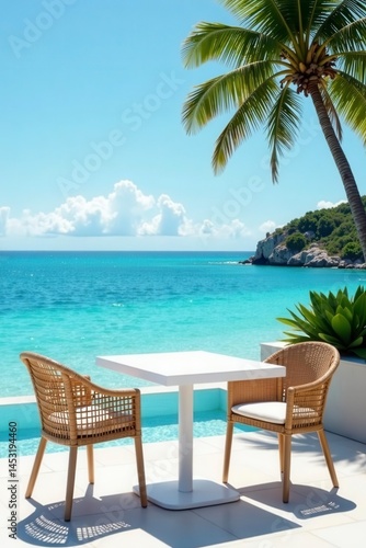 Modern white table and wicker chairs overlooking ocean, vacation, deck
