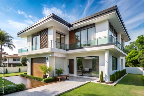 Modern White Two-Story House with a Green Lawn.