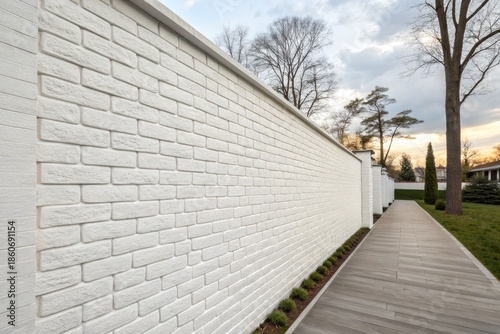 Modern White Wall With a Pathway Surrounded by Trees in a Residential Area