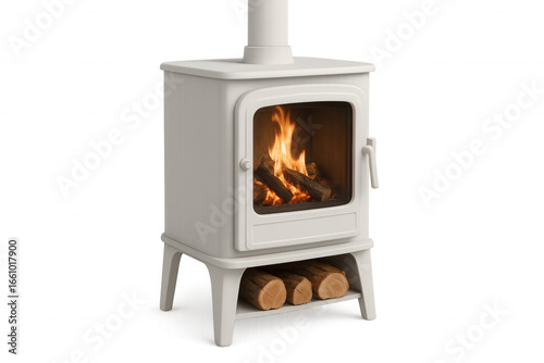 Modern white wood burning stove with burning firewood, providing warmth and comfort, isolated on transparent background