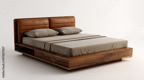 Modern wooden bed with leather headboard and beige sheets on white background