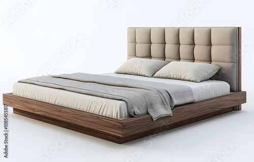 Modern Wooden Bed with Tufted Headboard and Bedding
