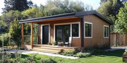 Modern wooden cabin with glass doors, patio furniture, and garden surrounded by greenery.