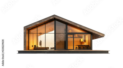 Modern wooden cabin with large windows on transparent background